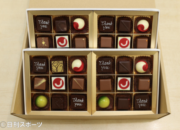 其中有缀着「Thank you」字样的巧克力,以及代表着杰尼斯事务所的“J”字巧克力、红色巧克力采用了樱井翔的红色应援色作为主打色调,而绿色巧克力采用了相叶雅纪的绿色应援色作为主打色调啊。整体来说,是一份非常精美且用心的伴手礼。