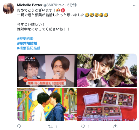 另外根据「日经SPORTS」的报道,樱井翔和相叶雅纪这两位国民级明星还非常会做人。在闪电结婚之后,二人向各大媒体都寄来了点心小礼物(附公开信)。点心是由东京都一家有名的酒店制作的巧克力。