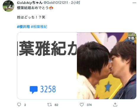 (译:祝贺你们结婚!啊我竟然有一瞬间感觉是翔君和相叶君二人宣布结婚了呢。我现在实在是太高兴了!请你们一定要幸福啊!)