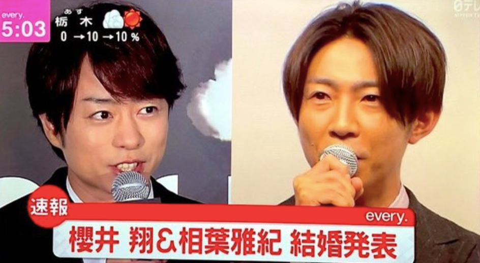 今天newsevery的藤井主播播报这段新闻时也激动得语无伦次,还特别温馨提醒大家:“光看这个画面,仿佛感觉是樱井桑和爱拔桑结婚了…但,他们是一起发布了【各自】的婚讯。”