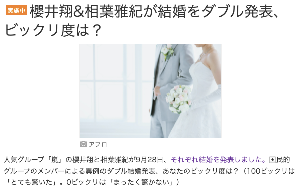 一向正经的「Yahoo Japan」也来凑热闹,开始了一项“樱井翔&相叶雅纪双双宣布结婚,你的震惊度是多少”的调查,这项调查才刚刚开始,就已经有超过一万名网友进行了投票。