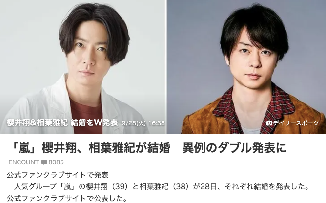 日本国民组合ARASHI,在其人气成员二宫和也宣布在2019年结婚之后,39岁的樱井翔,以及38岁的相叶雅纪也在今天(9月28日)双双宣布结婚喜讯。