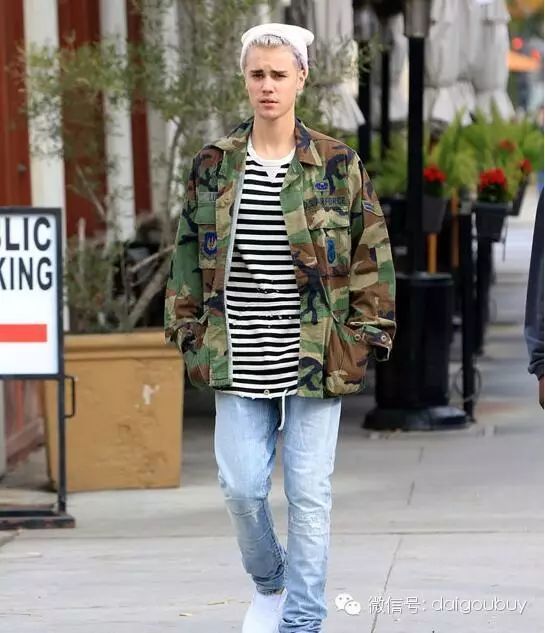 贾斯汀-比伯 迷彩外套帅气有型 条纹针织衫个性出挑 有型有款