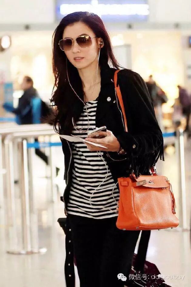 张柏芝 黑白条纹衫搭配流苏麂皮外套再戴上飞行员墨镜真是酷毕了。