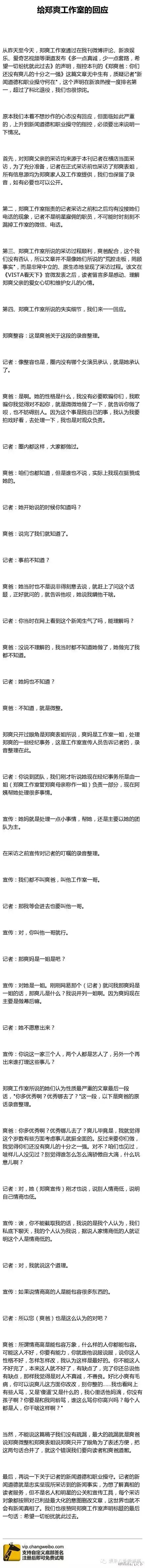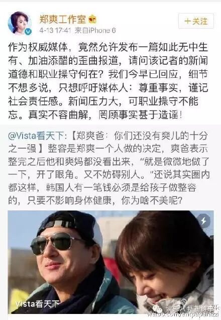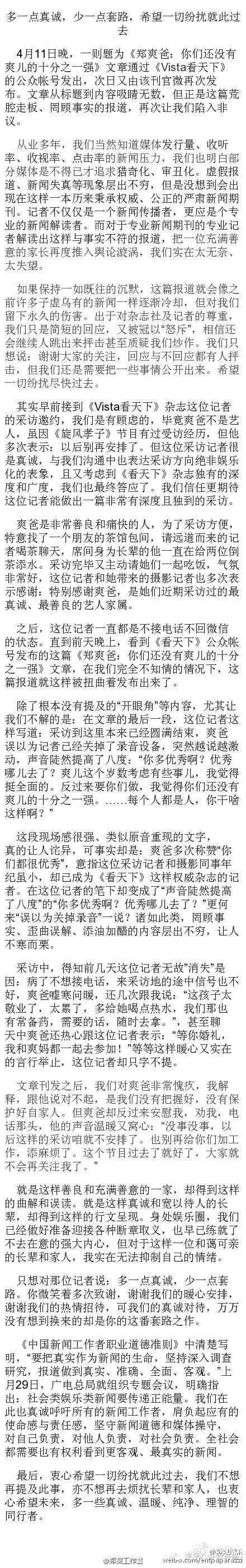 4月13日,郑爽工作室官微发声,质疑Vista看天下记者职业操守,指责对方歪曲报道。