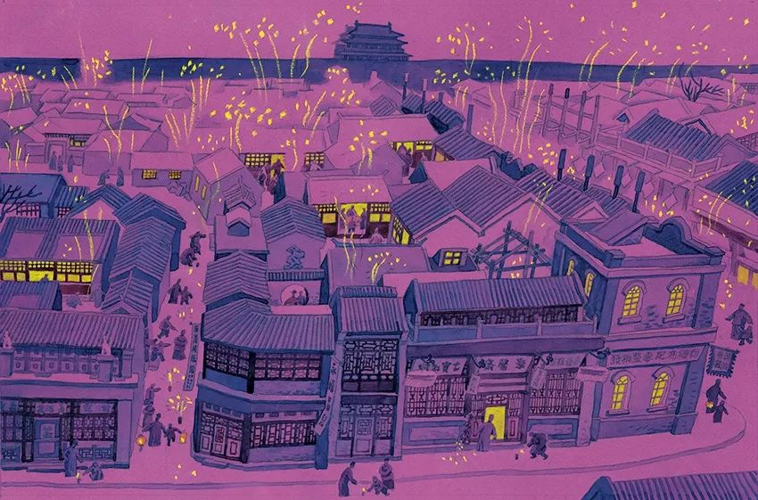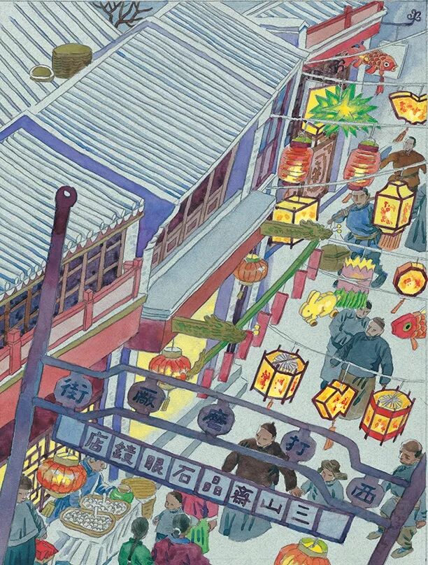 从腊八起,铺户中就加紧地上年货,街上加多了货摊子——卖春联的、卖年画的、卖蜜供的、卖水仙花的等等都是只在这一季节才会出现的。这些赶年的摊子都教儿童们的心跳得特别快一些。在胡同里,吆喝的声音也比平时更多更复杂起来,其中也有仅在腊月才出现的,像卖宪书的、松枝的、薏仁米的、年糕的等等。
