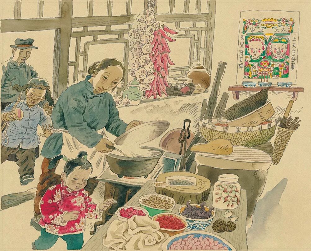 过了二十三,大家就更忙起来,新年眨眼就到了啊。在除夕以前,家家必须把春联贴好,必须大扫除一次,名曰扫房。必须把肉、鸡、鱼、青菜、年糕什么的都预备充足,至少足够吃用一个星期的——按老习惯,铺户多数关五天门,到正月初六才开张。假若不预备下几天的吃食,临时不容易补充。还有,旧社会里的老妈妈论,讲究在除夕把一切该切出来的东西都切出来,省得在正月初一到初五再动刀,动刀剪是不吉利的。这含有迷信的意思,不过它也表现了人们确是爱和平的人,在一岁之首连切菜刀都不愿动一动。
