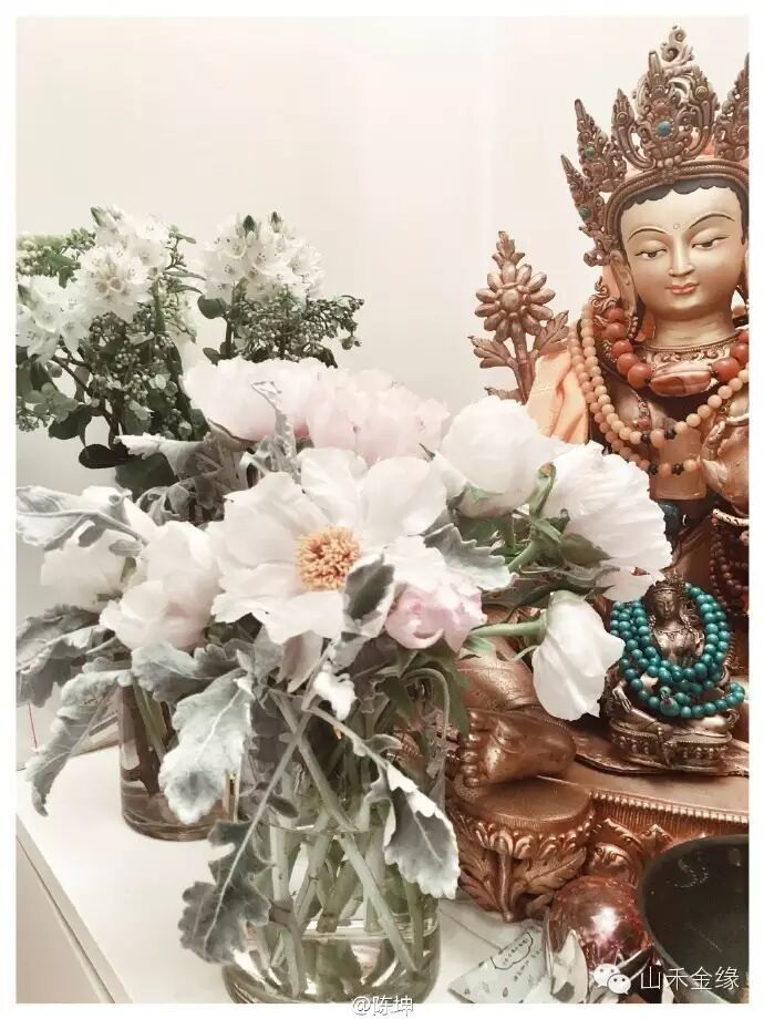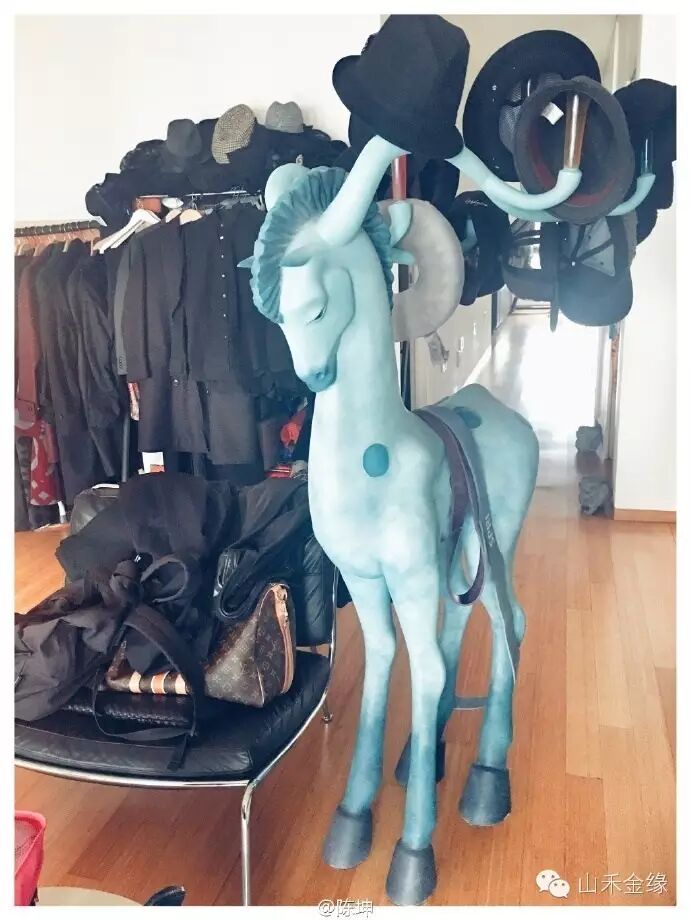 陈坤家充满艺术氛围,佛像前供着鲜花,休息区摆满了书籍,衣帽架也是一只造型独特的马......
