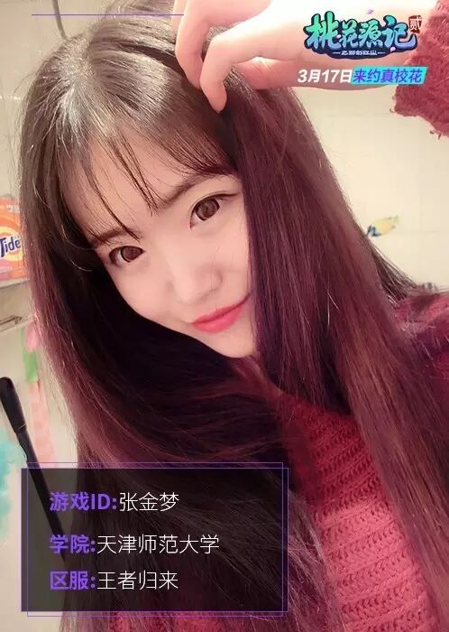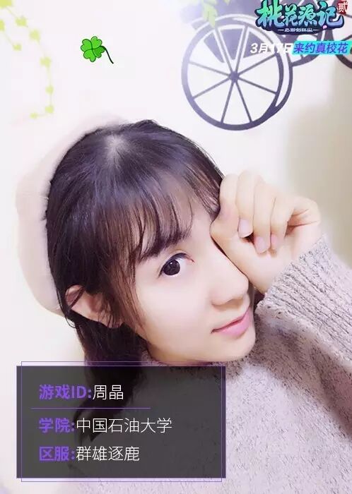 中国石油大学会计经济与管理专业的周晶,身高166cm,体重46kg,射手座。座右铭“千里迢迢,只为等你来!”如果能够和这位女神游戏牵手,相信你的《桃花源记2》之旅会事半功倍哦!