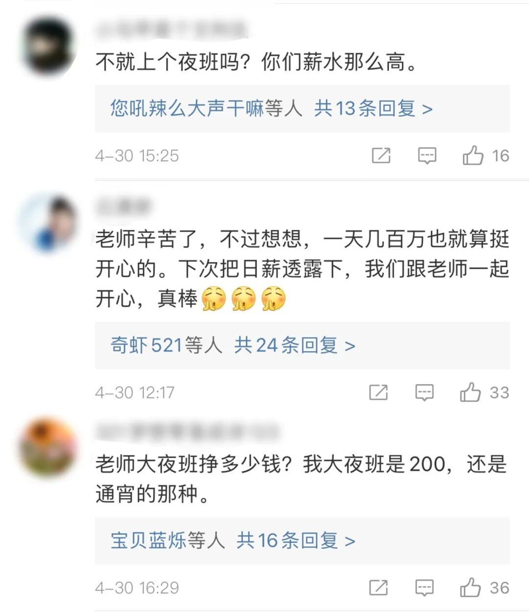 网友们愤愤留言:几百万一天,上个夜班也感叹?你依法纳税了没有?