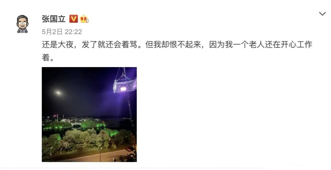 张国立5月2日晚上发微博表示“但我却恨不起来,因为我一个老人还在开心工作着。”
