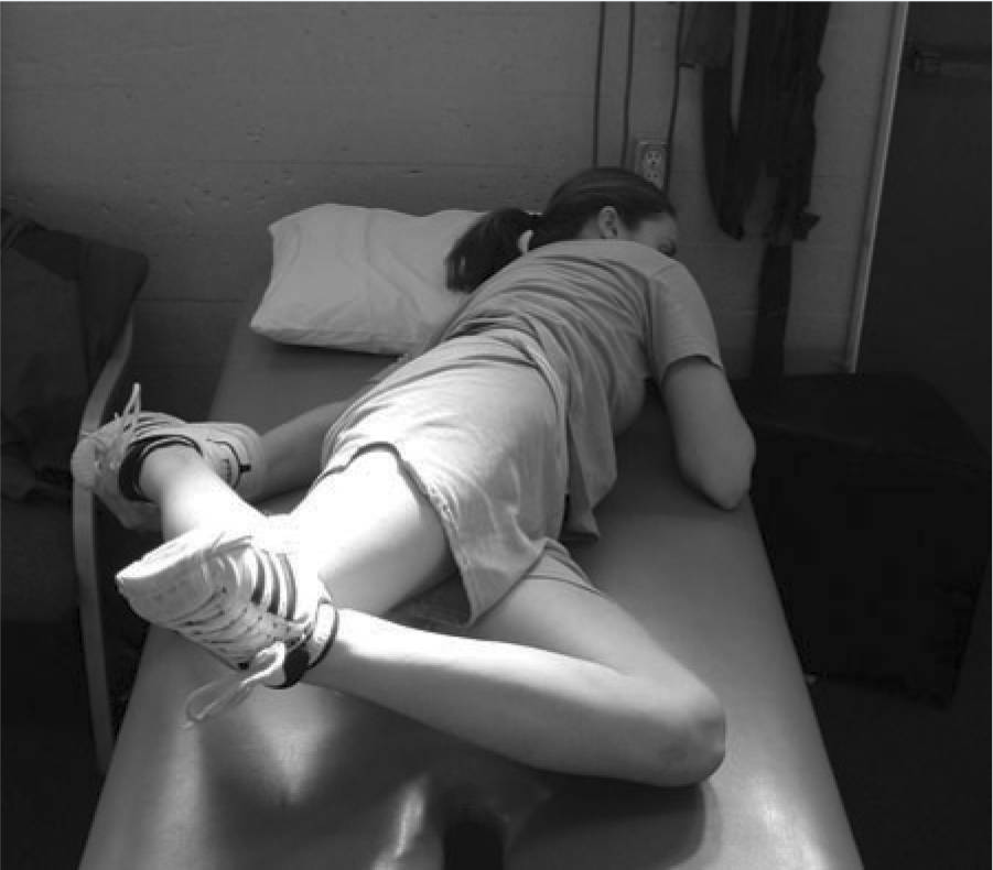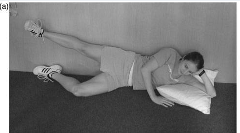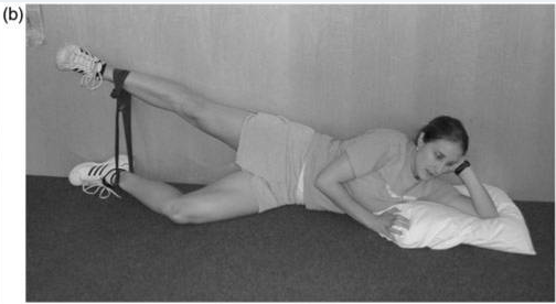 侧卧髋外展练习,属于臀外展肌等距收缩,保持在髋关节外展约30度处,并有轻微的髋关节外旋和中性髋关节伸展。