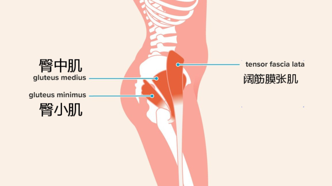 大部分人的臀中肌都是很弱的,臀中肌薄弱,阔筋膜张肌就会代偿,阔筋膜张肌紧张就会提高髂胫束的张力,从而导致髋膝外侧的疼痛不适。
