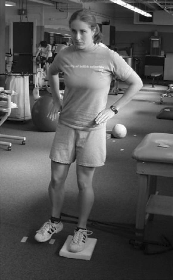 站立式骨盆稳定练习是另一种等距收缩。练习者使用疼痛的腿支撑,然后使用弹力阻力带绑住另一条腿的脚踝,在整个运动中保持骨盆稳定。