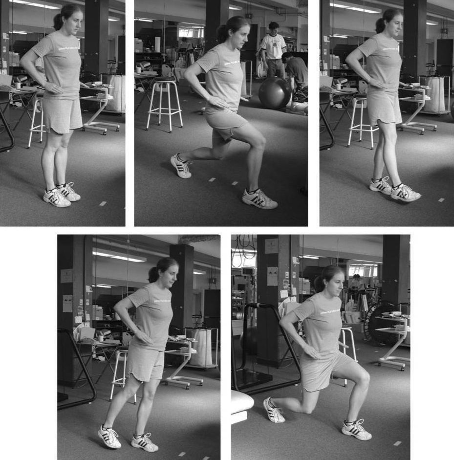 向前弓步。进行这项运动时保持骨盆水平。保持一只脚踩下,另一只腿上向前挺起,然后在同一只腿上向后挺进。这被认为是一次重复。重复5组。