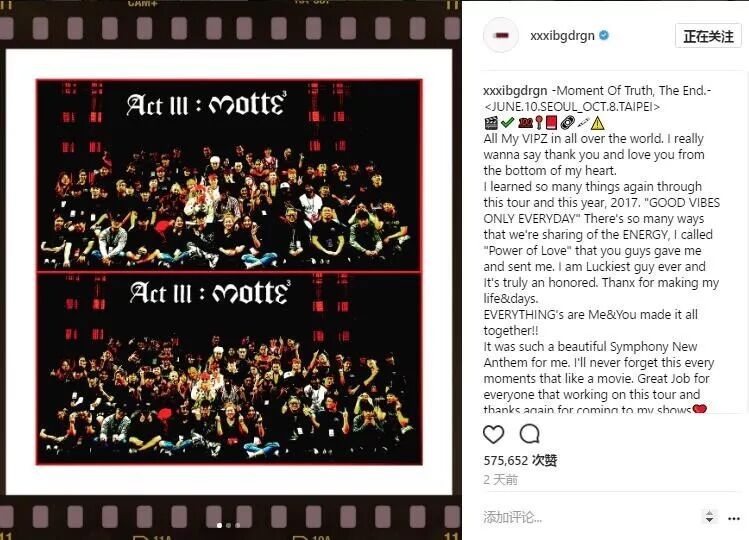 母胎结束后,GD在INS更新,上传了与工作人员们的大合照,并且附上了长篇文字。昨日和今日早,GD两度修改配文内容,仿佛是有说不完的感想,可见此次巡演对其意义之重大。