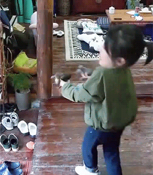 又或者是和小动物放松地玩耍,被小狗舔一下,被小鸭子吓得“一秒头大”……