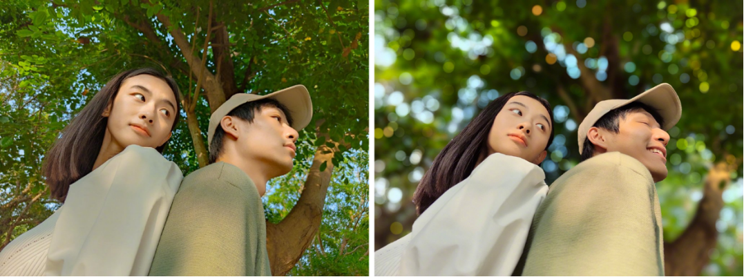 独家的焕采光斑人像功能,可以将背景光源实时虚化为自然光斑效果。