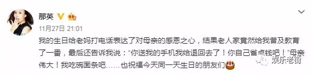 11月27日那英生日那天,那英粉丝后援会曾晒出一张那英和老公的合照,照片中那英和老公一起切蛋糕,心情很好。晚上9点多的时候还发了一条微博,说自己给妈妈打电话,本来是感激妈妈,但是没想到却被妈妈批评了一顿,还收把那英给她买的手机退回去了,让那英省着点花钱。不得不说,这样的明星妈妈还是很接地气的。