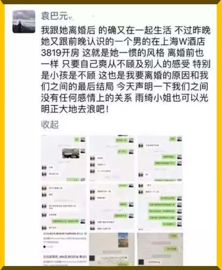 这一次,袁巴元在朋友圈里晒出一组聊天截图,爆料张雨绮偷偷约会其他男人。