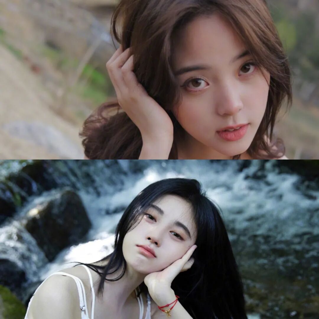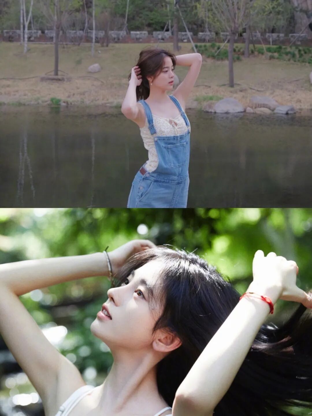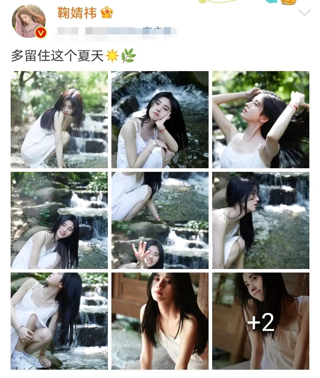 就在同一天,当红小花鞠婧祎也晒出一组泉边嬉戏的照片。