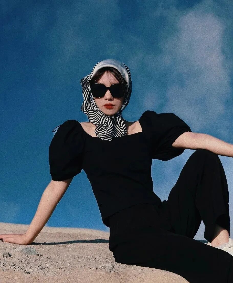 也可以是这样式的,在郊外的傍晚裹一头丝巾,墨镜一戴,妥妥的美式田园风。