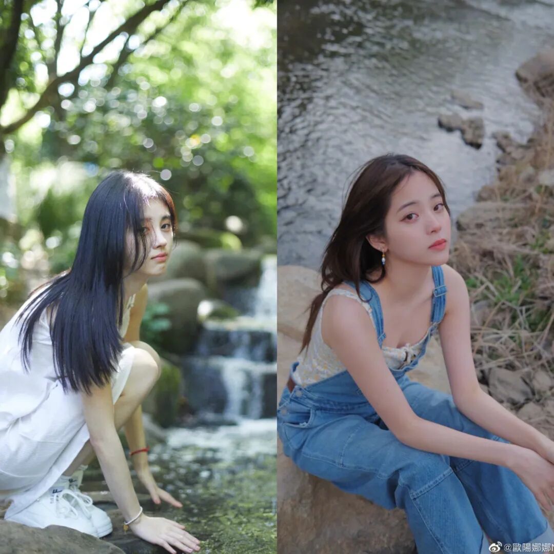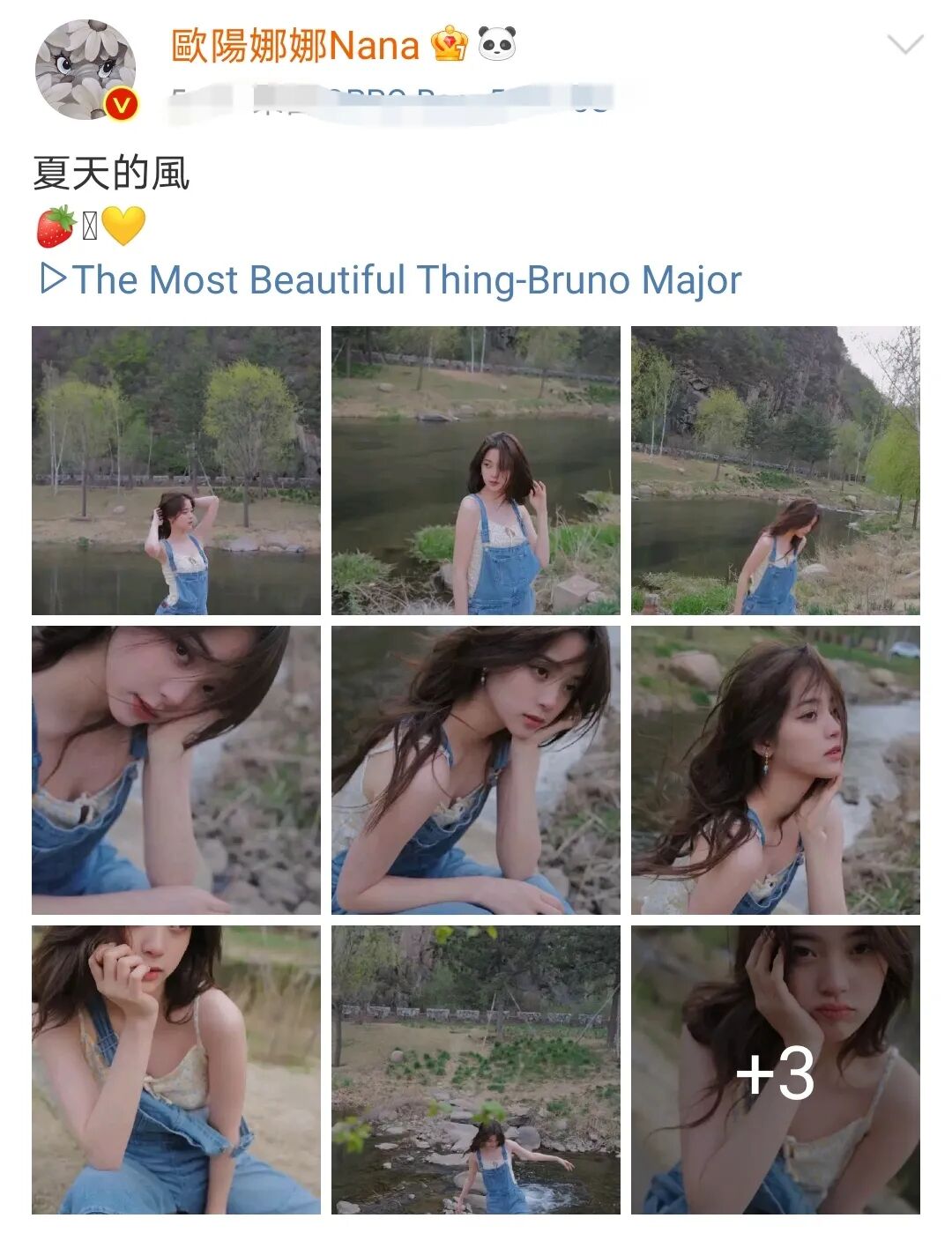 前几天,欧阳娜娜也穿着小吊带在微博上晒了一组夏日风的照片,配文“夏天的风”。