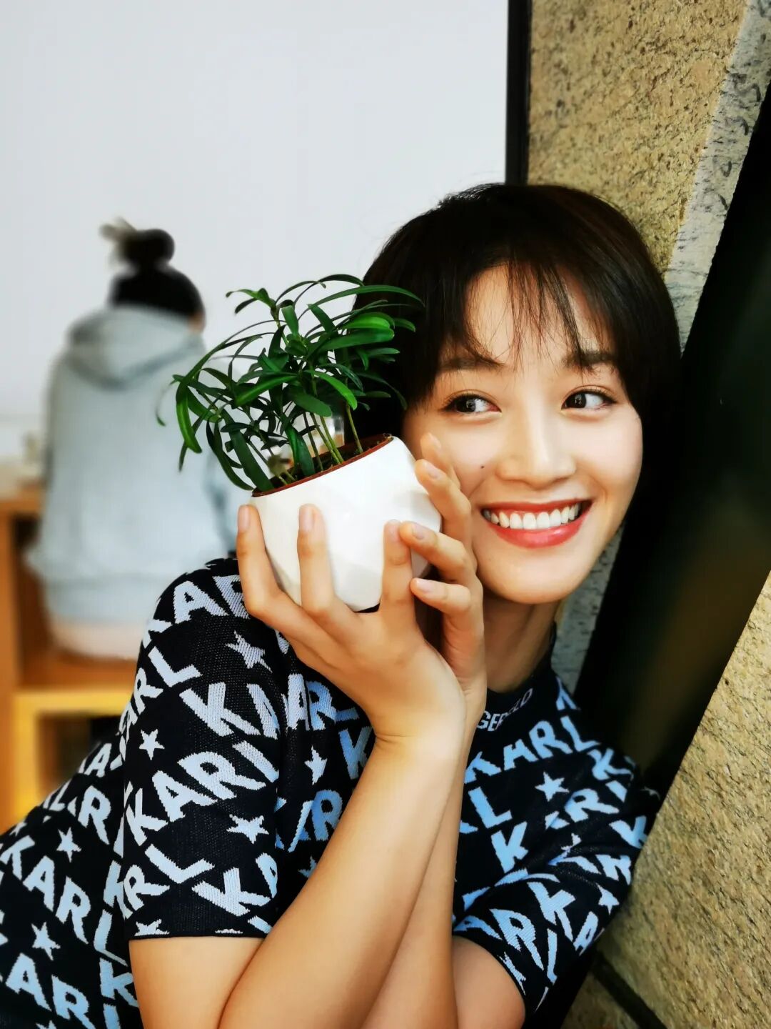 打开蓝盈莹微博看看近照,一头清爽的短发,手捧绿色小盆栽,很有胶片少女的氛围。