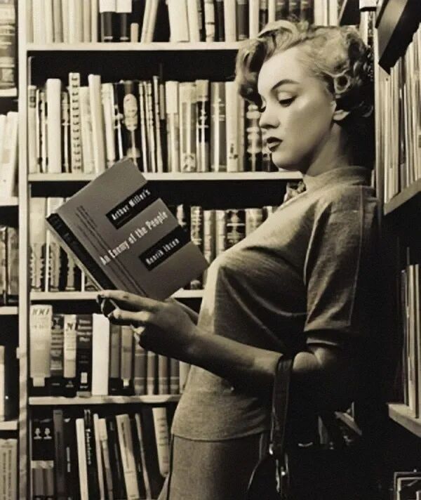 再看看梦露这张照片,倚靠在书架的一侧,安安静静阅读易卜生的《人民公敌》。美则美矣,也全然有了灵魂。