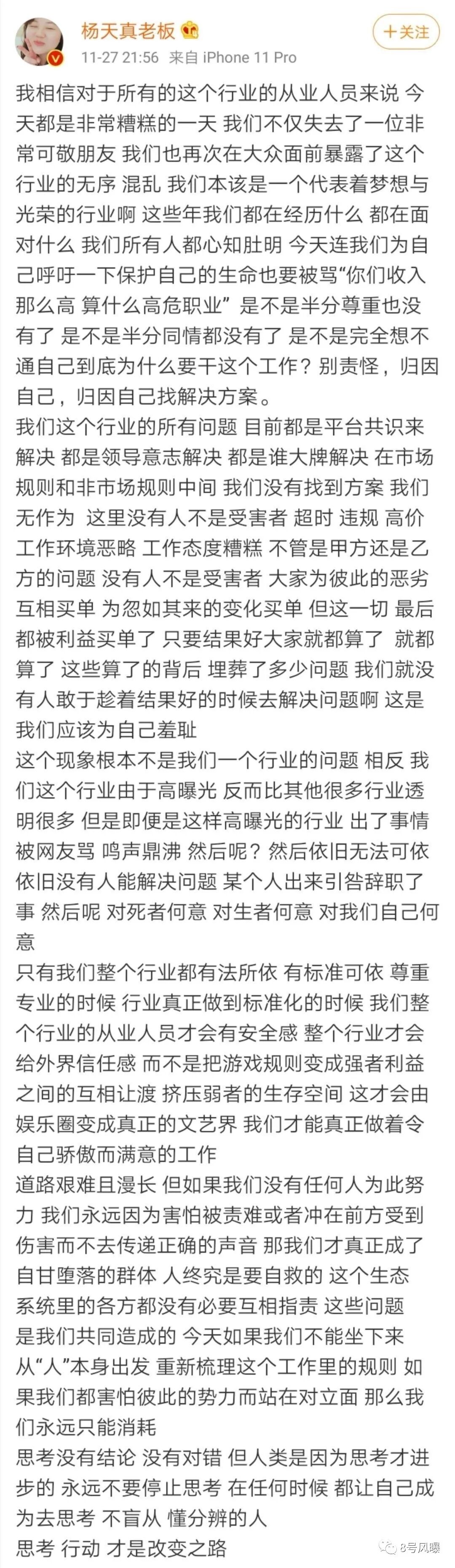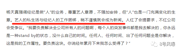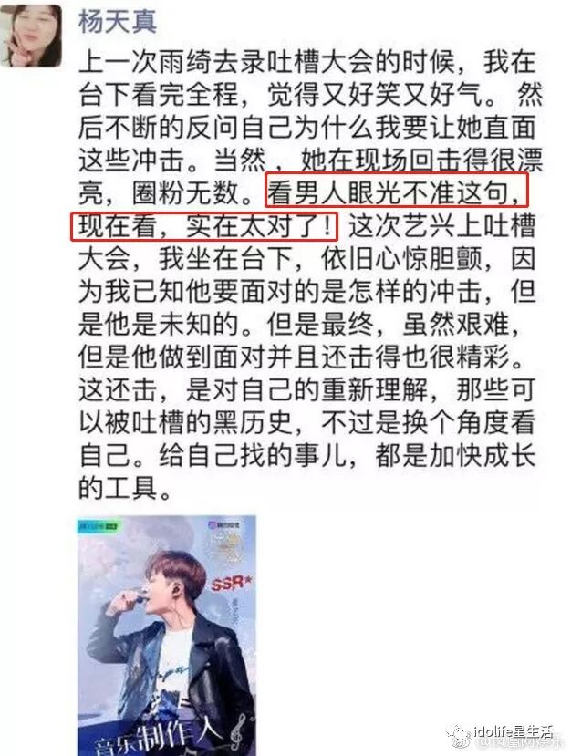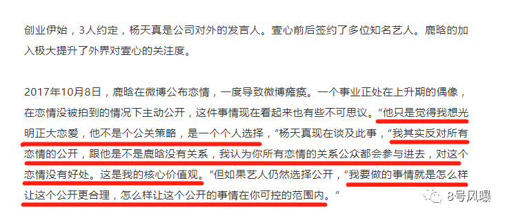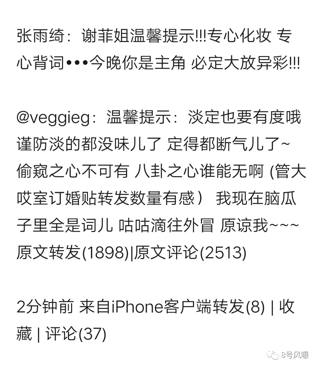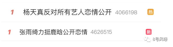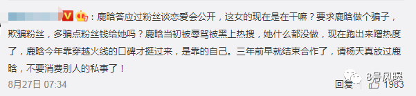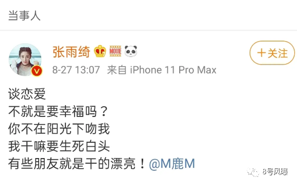 鹿晗都公开恋情3年了,还需要张雨绮力?挺?吗? 8号风曝 内地男星 2020-08-28 13:58:50 1544 创作不易,用心坚持,欢迎请BaGua喝几杯爱心咖啡!打赏并支持本文 打赏并删除本文 猛的一看,还以为张雨绮和鹿晗公开恋情了↓ 阳光下吻我、生死白头……这梦回非主流时代的QQ空间文学,实际上拉开了一出好戏! 事情是这样的,前不久刚刚宣布卸任所有艺人经纪业务、转场直播赛道的杨天真女士,在陆续发表“为什么不可以为了工作牺牲身体呢?”等言论后,最近又有新观点轰轰烈烈诞生。 在接受采访时,杨天真谈到了3年前鹿晗公开恋情之事。 那一天盛况仿佛还在眼前,鹿晗关晓彤猝不及防平地炸出一声惊雷,官宣恋情了,“大家好,给大家介绍一下,这是我女朋友”“哎呀嘛,咔咔的!” 3年后再复盘,杨天真觉得这是鹿晗的“个人选择”,想正大光明谈恋爱,并非“公关策略”。但从她的立场出发,杨天真反对所有艺人公开恋情,因为“公众会参与进去,对恋情没有好处”。 但如果艺人还是决意公开,作为经纪人就要让这件事变得可控。 她举了个例子,为了给鹿晗公开恋情做铺垫,当时壹心提前和媒体通气,接下来的一周持续监控全网舆情,最怕出现“粉丝自杀”的新闻。 其实站在经纪公司的角度上,杨天真的考量是有道理的。艺人、粉丝和经纪公司的出发点并不同,经纪公司追求利益最大化,如果艺人公开恋情后劈腿、出轨就直接是沉没成本了,所以她也说“艺人私生活稍有不慎就会成为新闻”。 但是这段采访被掐头去尾地搬运后,就变成了简单的“杨天真曾反对鹿晗恋情公开”“杨天真反对所有艺人恋情公开”↓ 首先是鹿晗这边,3年前也是从全网反对的风暴中走过来的,但如今以一年两次的稳定频率在双方过生日时秀恩爱,不作妖也不过分扎心,感情稳定。 能把坚持了1000多天的分手打卡bot熬死的,估计也就这一对了。 再加上2018年2月鹿晗在壹心的合约期满,正式结束合作关系↓ 所以杨天真此言一出,鹿晗粉丝立刻开火切割,“别cue了”“求放过”↓而另一边,张雨绮便发了开篇的那条微博,并@鹿晗。 给人观感同样差到谷底,鹿晗都公开3年了,当初全网反对时你不力挺,现在迟到的力挺又有什么用?还有直接指明她就是在蹭热度的↓更惨的是鹿晗,人在家中坐,两口锅从天上来,简直成了没有感情的辩论工具人。 上午还在被反对公开,下午又被力挺,真·在劫难逃。前是前老板,后是前同事,真·无鹿可走↓ 而张雨绮的这波发言,可以说是弊大于利。她的这几年,星女郎出道起点之高,私生活方面结了又离、离了又持刀嚯嚯向前夫,这抓马的人生像极了韩剧。 也神奇般陷入了圈一波路人好感→再亲手打碎的怪圈中,循环反复……张雨绮两次婚姻一直让人津津乐道,和相差21岁的王全安,组成老夫少妻组合↓即使张雨绮年轻、漂亮、身材好,然而也挡不住她在国外工作的期间,王全安连续三天嫖娼,其中有一次还叫了两名卖淫女子。 放着家花找野花,这……张雨绮表面上要和王全安共同承担,坦白面对,“相信执法部门会有公正处理。” 紧着就被拍到和其他男人约会↓次年王全安6月出狱,7月两人就正式办理了离婚手续。 和第二任老公袁巴元相识10天相恋,相恋70天即结婚↓可18年中秋节,袁巴元报案称因为家庭琐事和张雨绮产生肢体冲突,被张雨绮拿水果刀在背部划了两刀。前一天持刀干架,第二天就宣布离婚,有人说是因为袁巴元房产是假的,也有人说男方疑似出轨,不管怎么说,张雨绮这风风火火、敢爱敢恨的性格算是立起来了↓让人错愕的却是,离婚不过2个月,张雨绮就屡次被拍到和袁巴元挽手,更直接宣布复合,美名其曰“一个单身女人可以接受前夫的追求”。吃瓜群众可算是回过神了,新时代女性真的会这样吗?但是互联网的记忆总是短暂的,之后张雨绮在大小综艺上循环宣扬着自己的当代独立女性感情观。上《吐槽大会》主动玩梗,“我看男人的眼光确实不行”↓在《心动的信号》蹦金句,“我的底线是我又不怕失去你”↓直到2019年11月27日,高以翔录制浙江卫视综艺《追我吧》突发猝死离世,张雨绮这才迎来了第二次口碑大跳水。她发微博觉得明星是高危行业,咋高危的呢?工作时间高危,甲醛污染高危,不合理的危险拍摄方案高危,威亚高危,网络暴力高危……直接被批,“吃人血馒头”↓词条也关联上了↓再来就是这次,眼看着她参加《乘风破浪的姐姐》后,好不容易重新积攒的一波路人缘,又摇摇欲坠——初舞台顺拐依旧惹人爱,喜提“人间鹦鹉”“笨蛋小雨”等可可爱爱昵称,人们终于再次发现美艳御姐外表下藏了一颗憨憨心,用了十世的智商才换得今生的美貌……真想感叹一句,毁自己的路人缘这件事,还是得张雨绮自己上啊。其实吧,如果要说蹭热度,这也不是第一次张雨绮有类似行为了。 最早可以追溯到2010年10月29日,汪小菲大S承认订婚正好赶上了王菲的复出演唱会,那时候的天后还是冲浪选手,发了条微博调侃大S。 而张雨绮转发表示感谢,称“今晚你是主角”↓当年的网友可真敢说,有人觉得王菲是在力挺张雨绮;也有人说,张雨绮就是自作多情,故意对号入座,借王菲炒作↓ 再往后,张雨绮也活成了5G冲浪选手,每每有热点事件,她都冲出来发言表态。 单单是这两年——俞敏洪认为“女性的堕落导致了国家的堕落”,张雨绮就立马回怼,直接@俞敏洪↓ 高以翔意外去世,张雨绮感叹“明