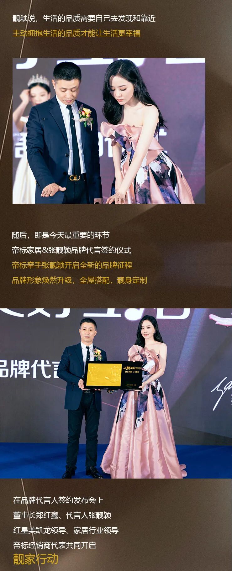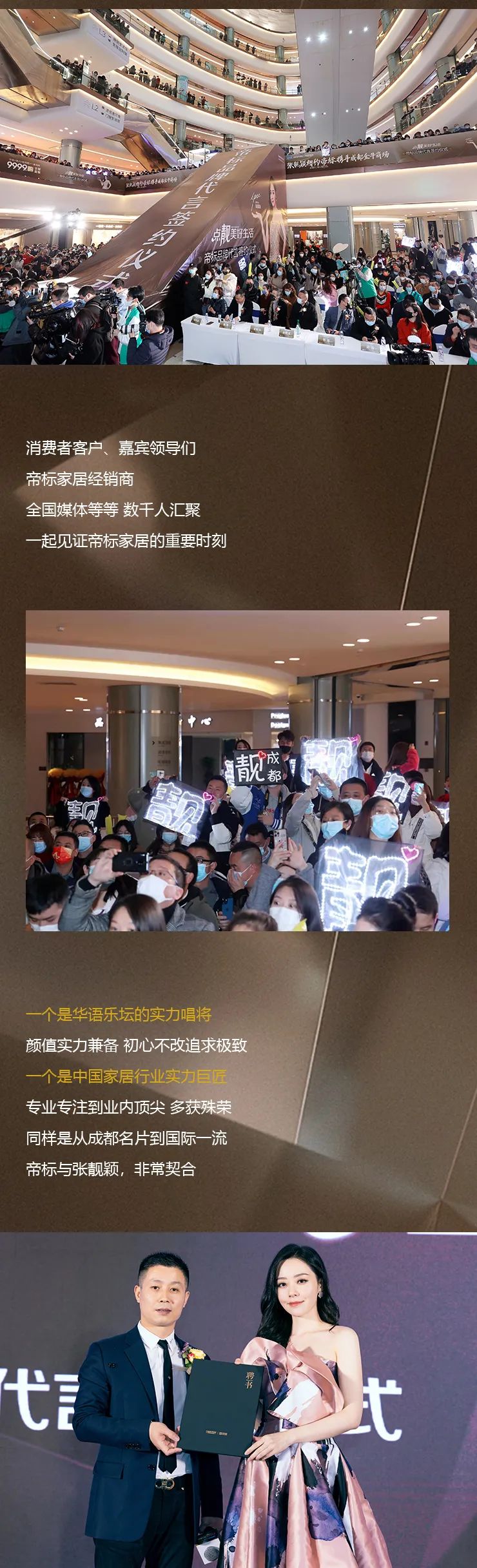 ,帝标家居正式官宣张靓颖为品牌形象代言人,双方签约仪式在红星美凯龙成都金牛商场隆重举行。