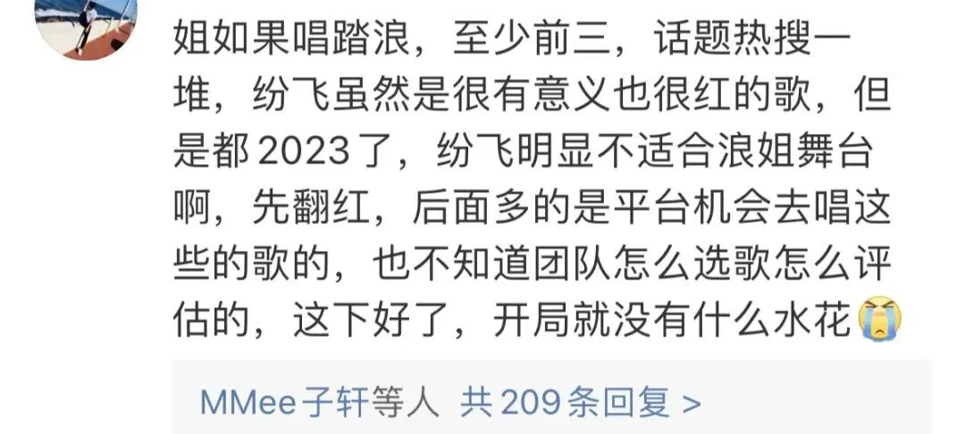 一首《分飞》唱得略艰辛,确实不如参照王心凌的《爱你》,选择更适合现场氛围、传唱度更高的《踏浪》或《我是女生》。