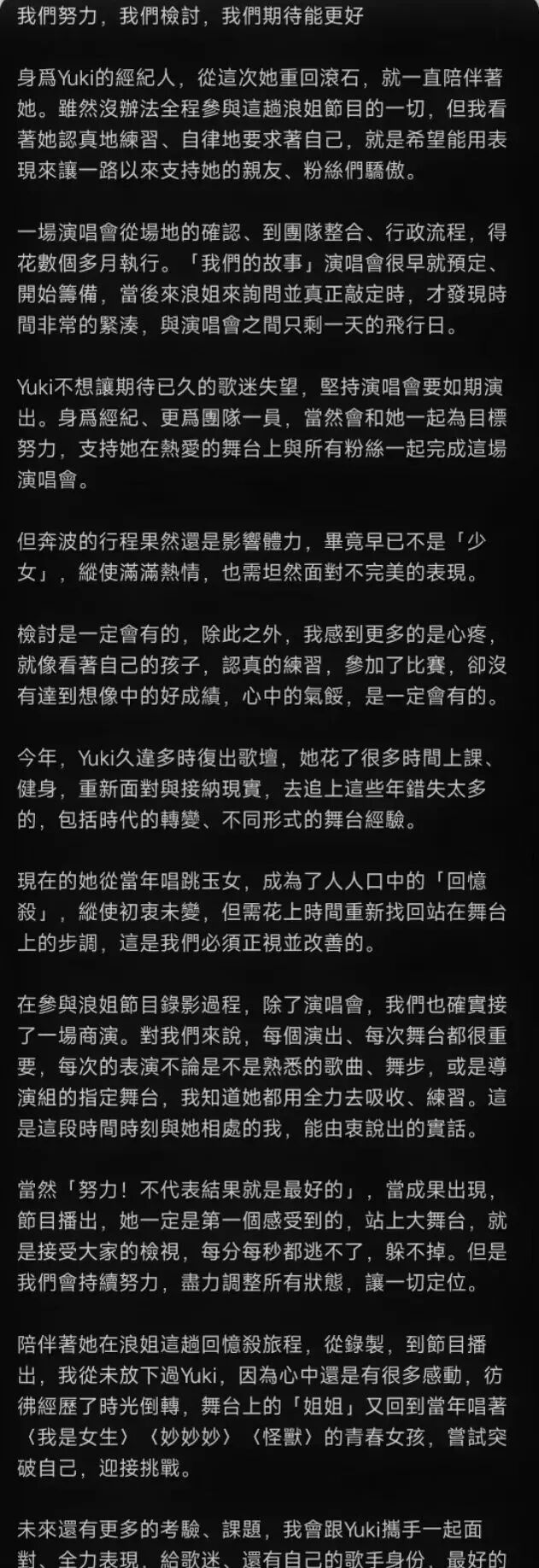 经纪人发长文,承认徐怀钰的档期与浪姐排演撞期。