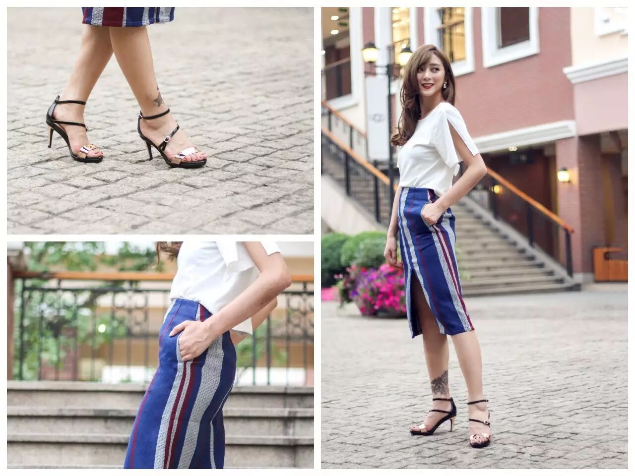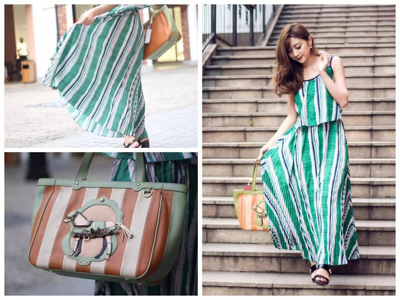 看了众多普通款之后发现,长裙质感好坏的关键在于花色和腰部设计!首先说花色,蓝绿色条纹相间的图案,不仅更显清爽,竖条纹更加修身,看起来超显瘦~