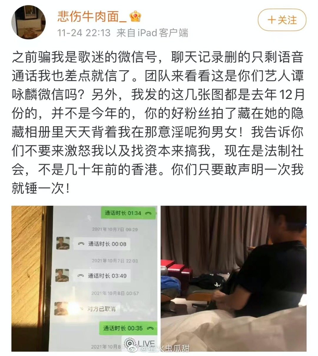 在后续的爆料中,他陆陆续续放出谭的照片等,不过,并没有实锤。