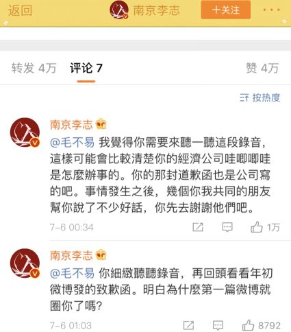 李志在发布录音的同时,还特意艾特了毛不易,他直言年初时毛不易的道歉函根本是由他的经纪公司哇唧唧哇代写,而毛不易本人根本不清楚自己的团队是怎么办事的,对侵权的道歉也毫无诚意。