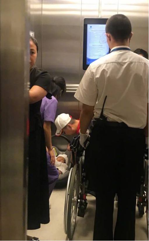 一起随行的还有两人的大儿子“小虎子”,虽然只有十一岁,但小虎子的身高却快要赶上陈建斌了,一行人上了电梯后,陈建斌蹲在角落里认真的看着小儿子,场面温馨极了。