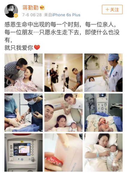 前两天刚生了二儿子的蒋勤勤,今天清晨在个人社交平台发了许多生产时的细节照片,并配文:“感恩生命中出现的每一个时刻,每一位亲人,每一位朋友….只愿永生走下去,即使什么也没有,就只我爱你”,行文间洋溢着满满的幸福感。