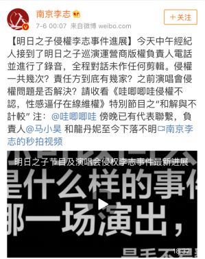 录音中李志的经纪人在与《明日之子》方面沟通的时候,直接指出当初的道歉声明没有一点诚意,既没有提到实际信息,主办方哇唧唧哇也没有出面,录音中还透露在巡演中被侵权的不只是李志,但是除了李志其他被侵权的音乐人已经给了授权协议,对此《明日之子》方面解释说是因为李志方面曾经说“不是钱的问题”。