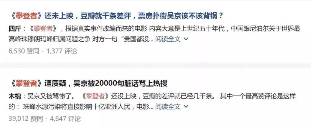 最早《攀登者》的预告一放出来,大家关注的其实都不是影片本身,而是给它戴上了“吴京新片”的标签,于是还没点映就引来了大量影评人和网友的吐槽……
