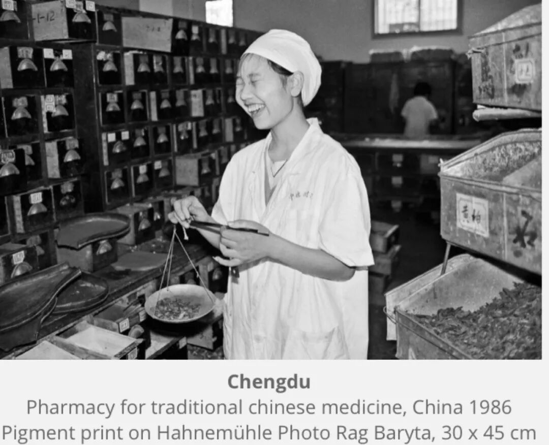 当然,从Christine de Grancy 众多记录中国的照片里,我们还可以看到80年代山西的煤矿工人,山西大同正在表演皮影戏的老人,北京绿皮火车里望着镜头的工人,四川成都中药店里的采药姑娘,西安春节的街道上,一位用木质的非常特别的婴儿车,推着自己孩子的父亲或爷爷等等这些丰富质朴的80年代的中国影像。我在想,要是彩色照片也许更能把当时场景准确生动地呈现,但是黑白照片却更能带给我一种心灵的冲击感,每一张照片都静默着,但其实有的不仅仅是静默,因为里面的人物经常是动态的,他们的笑容,在黑白照片里,更像是在幽幽山谷里的无尽的回声,或是深蓝色夜幕中一轮皎洁的月牙。