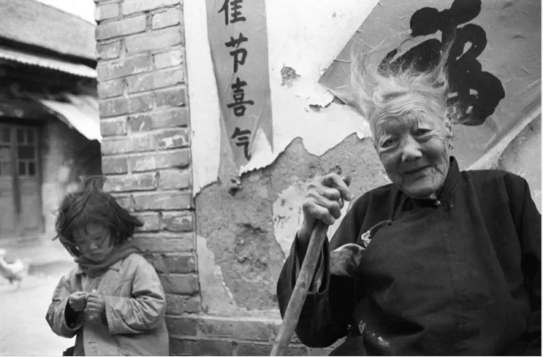 其实我最喜欢的照片是Christine在山东拍的一张,因为时间在这张照片中留下了太多痕迹:一位年迈的老人和蔼地看着镜头,脸上的皱纹让我想起了黄土高原的沟壑,那也是承载着中国最沉重原始的历史的地方。左手紧紧握着一根再简单不过的木质拐杖。苍白的头发在风中摇曳着。背后则是一面粘着“福”字的墙和右手边残缺的春联,墙上的一块块漆皮大概也是因为年代久远而脱落了下来,所以坑坑洼洼的冷冰冰的混泥土墙则暴露在了空气之中,任凭寒风习习拍打着,与“佳节喜气”形成了鲜明的对比,又与影像中的老人浑然天成。再看墙角处还站着一位撅着小嘴,玩自己小手的女孩,这张照片中的一切:小孩与老人,黑发与银发,春联与白墙,甚至还有左边虚化的背景,一只家禽若无其事地走在一家老旧的屋舍前,他们都相互衬托,又相互交融着。后来Christine女士告诉我,这位老人是“莲足” ,我不禁想到,一位远道而来中国的摄影师,站在他们跟前,而这位摄影师所面对的是一位经历了中国近现代的大变革的年迈老人,旁边则是一位出生在80年代的小女孩,这样一个时间空间的对比,有时无不让我心生感叹。