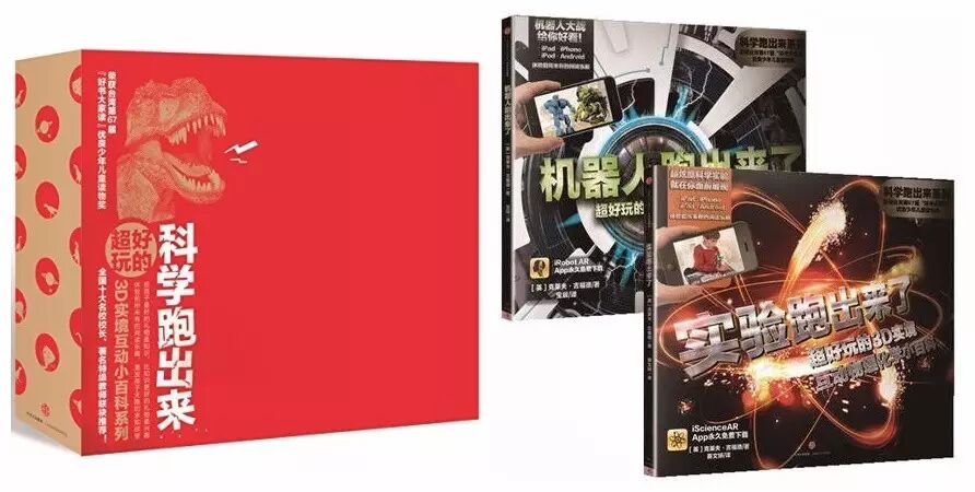 《科学跑出来》第一辑+第二辑由英国老牌科普出版社Carlton出品,中信出版社引进出版,是一套自带魔法效果的奇书——运用2015年度前沿“增强现实”(AR)技术,把真实世界的信息和虚拟信息同时显示出来,两种信息相互补充、叠加,第一辑书中包含《恐龙跑出来了》、《龙卷风跑出来了》、《太阳跑出来了》等四册,下载一个对应的APP,然后将这个APP对准书中指定的跨页后,神奇的一幕出现了:一只恐龙竟然活灵活现地出现在了眼前。