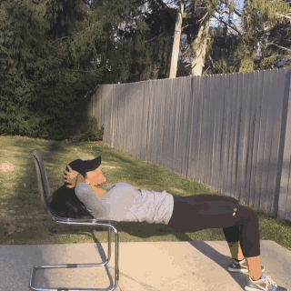 step1:肩膀靠在椅子边缘,臀部由下向上,这步有点像臀桥的加强版。共3组,每组15个。