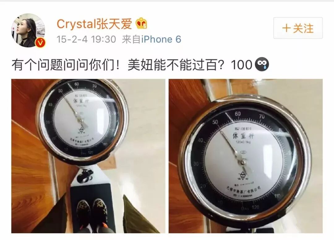 凭太子妃一炮而红的张天爱虽然个子不到168,但比例极好,怎么看都不像体重过百的人,不过微博里自己称过,刚好100斤~