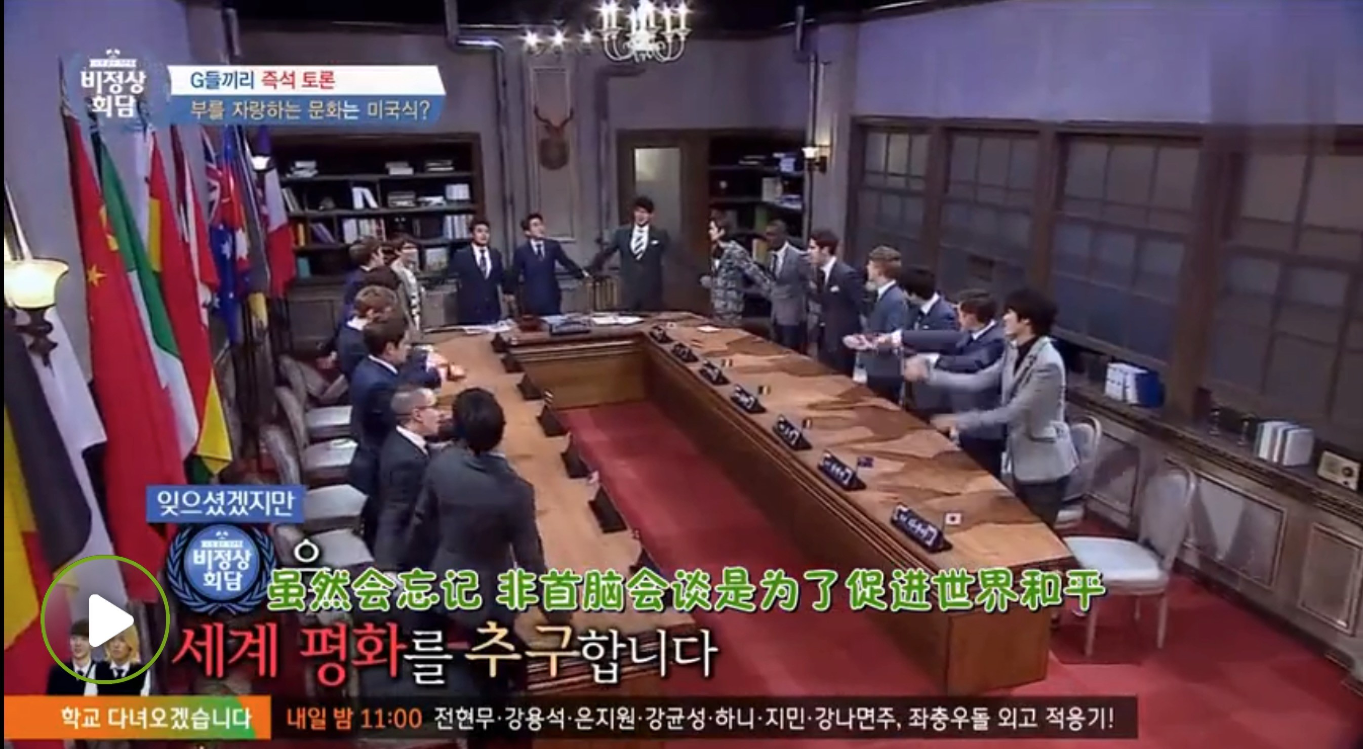 这档韩国JTBC电视台制作播出的谈话类节目,从形式到场景完全模拟首脑会议,内容则围绕韩国年轻人们最苦恼的议题来进行讨论、交流甚至争论。在这个节目里不仅世界帅哥云集,还走红了一位中国帅哥——张玉安欧巴。