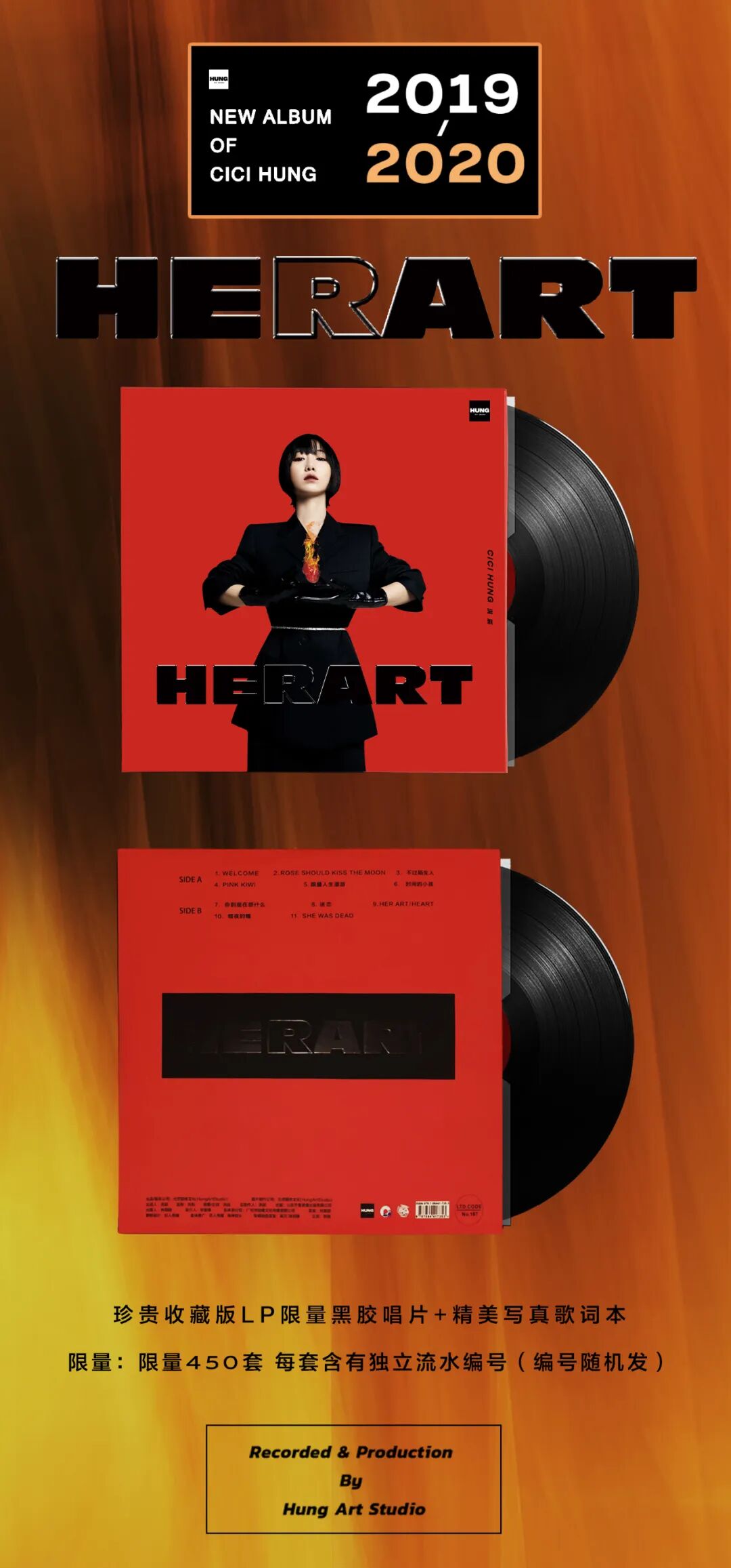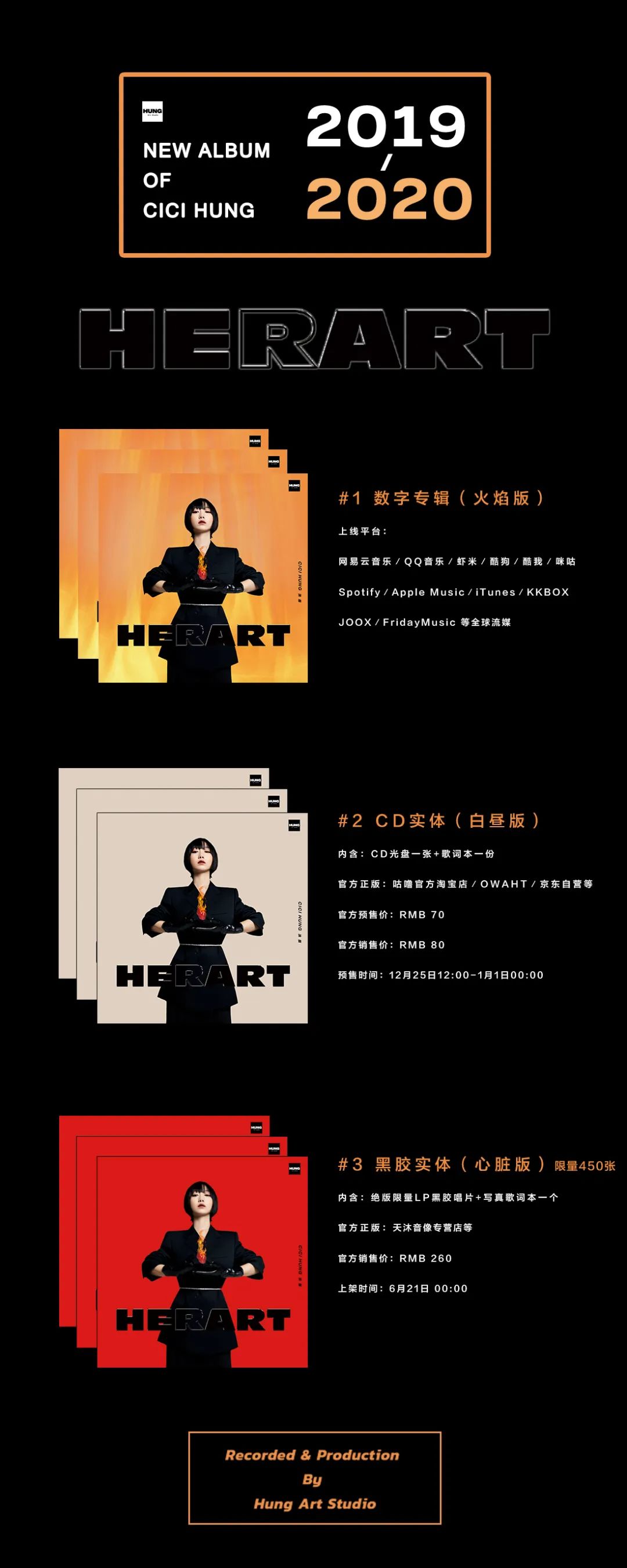 数字专辑已在网易云音乐、QQ音乐、Apple Music等全球各大音乐平台上线发布,CD实体也于京东、天猫等各网上商城上架售卖,而心脏版黑胶实体则将于本月21日零点在淘宝天猫正式开售。此次黑胶限量发售450套,内含精美大图写真歌词本一份,在底封设计了独立流水编号,专属限量,绝版珍藏。