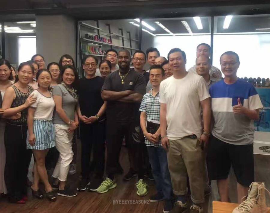 Kanye West 目前人在广东清远 adidas 万邦代工厂开发室中,正跟工作人员一起参与新款yeezy 700 与350 v2 开发制作,并在流水线上了解几款新配色350 v2的生产进度。