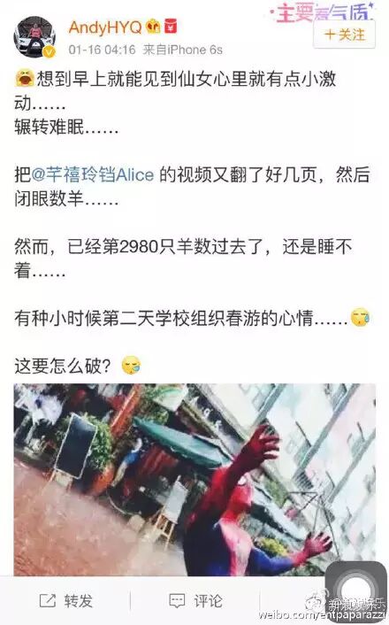 1月16日凌晨4点多他都还没睡觉呢,再次发微博“想到早上就能见到仙女就有点小激动,辗转安眠”