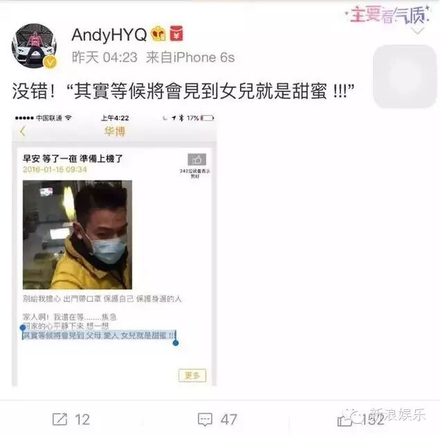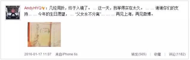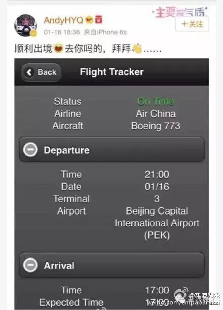 16日晚些时刻,他再次更新微博就变成了“顺利出境”,还附上了航班信息。约半小时后,他又发布了一张自己和女儿护照的照片,并写下“晚安大明星”。